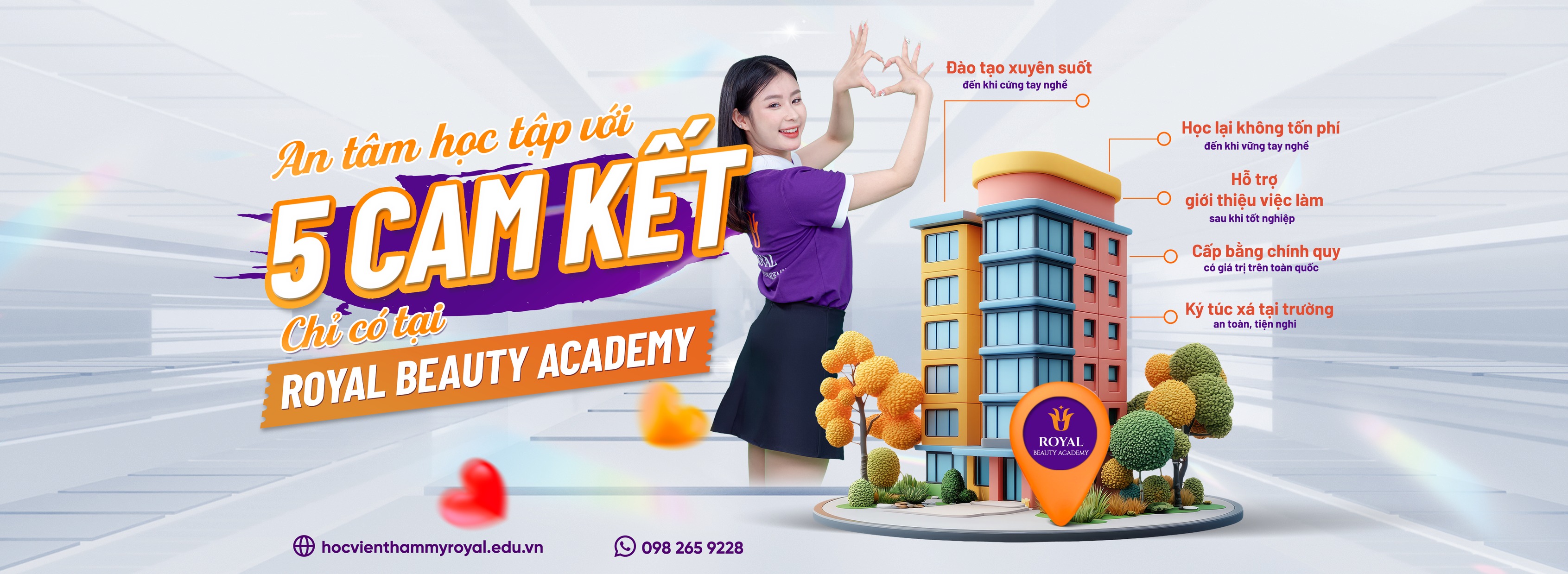 Học viện Thẩm mỹ Royal đơn vị đào tạo số 1 các khoá học liên quan đến chăm sóc sắc đẹp. Royal Beauty Academy cam kết hỗ trợ việc làm cho học viên sau khi tốt nghiệp, đào tạo bài bản với giáo trình bài bản chuyên nghiệp 85% thực hành 15% lý thuyết được biên soạn phù hợp với mỗi khóa học giúp cho học viên học tập tốt hiểu bài nhanh chóng và thực hành ngay tại lớp học đào tạo.Royal Beauty Academy là địa chỉ đào tạo chuyên nghiệp nguồn nhân lực chất lượng cao cho ngành thẩm mỹ, được sự cấp phép của Sở LĐTB&XH TP.HN.